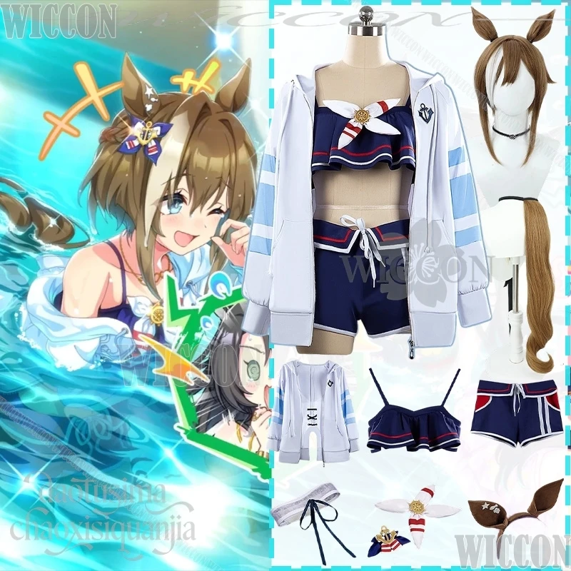 Game Umamusume: Pretty Derby Cosplay Cheval Grand Summer Kawaii Bikini Jirai Kei Girls Blue Coat Furry Ear Tail Comic Con Outfit