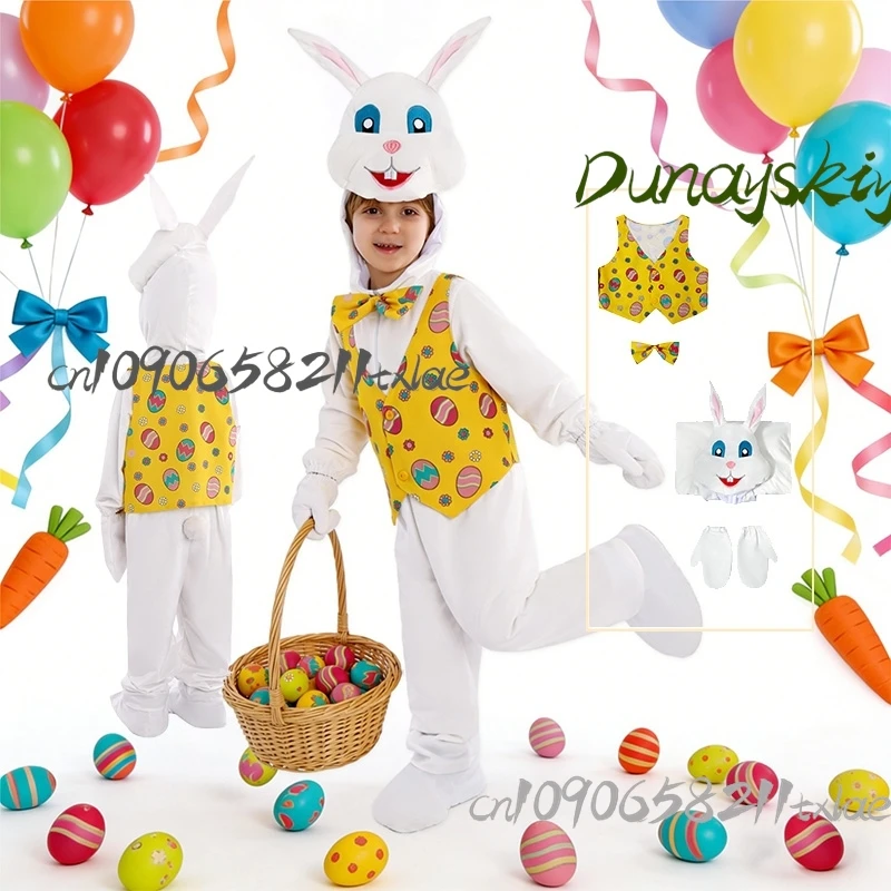 White Rabbit Headgear Jumpsuit Yellow Vest Bow Tie Boys Girls Cosplay Costumes Kawaii Plush Furry Pajamas Daily Carnival Easter