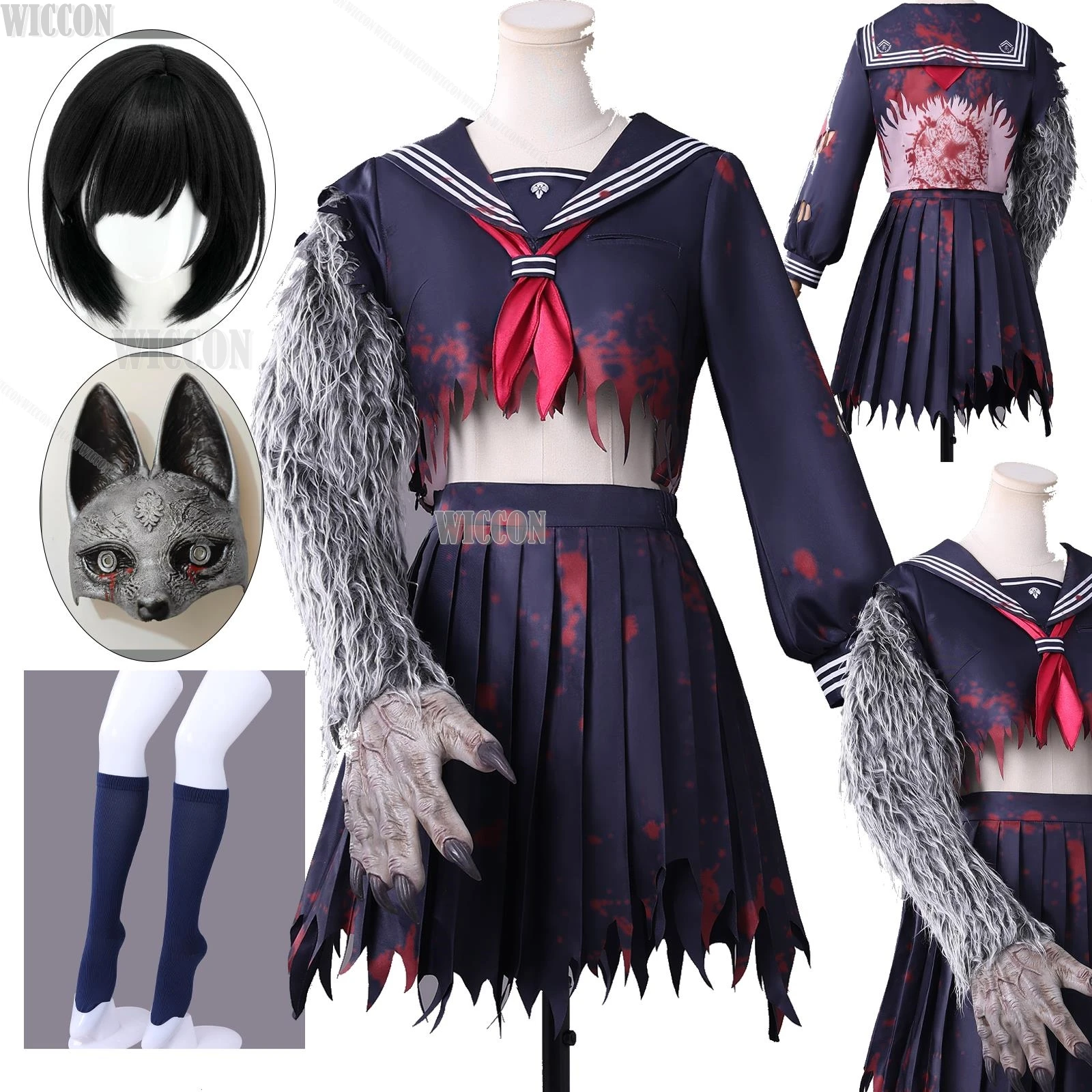 Game Silent F Shimizu Hinako Fox Furry Arm Cosplay JK Girl Navy Blue Broken Dress Full Set Mask Wig Halloween Festival Clothes