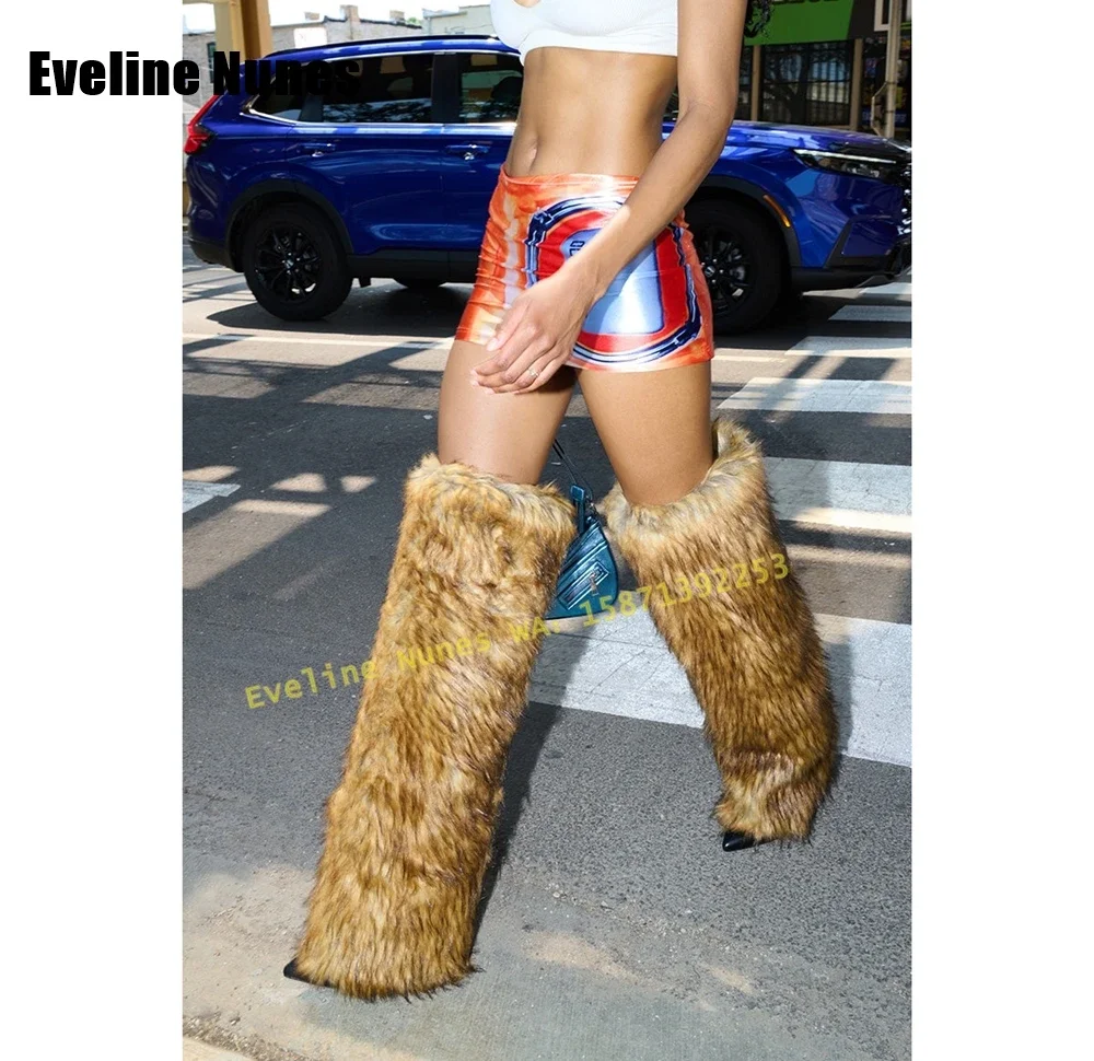 Brown Furry Fur Fashion Snow Boots Pointed Toe Thin Heel Pull On Sexy Spicy Girl Street Style Women Over The Knee Booties 2025