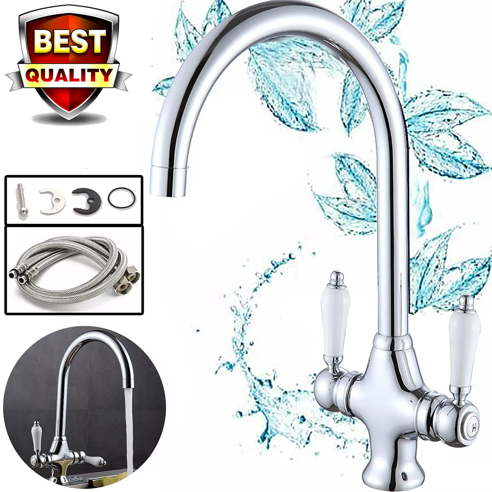 DayPlus Double Twin Lever Basin Mixer Taps Bathroom Kitchen Tap Hot & Cold Solid Brass Traditional Swivel Luxury Chrome Faucet