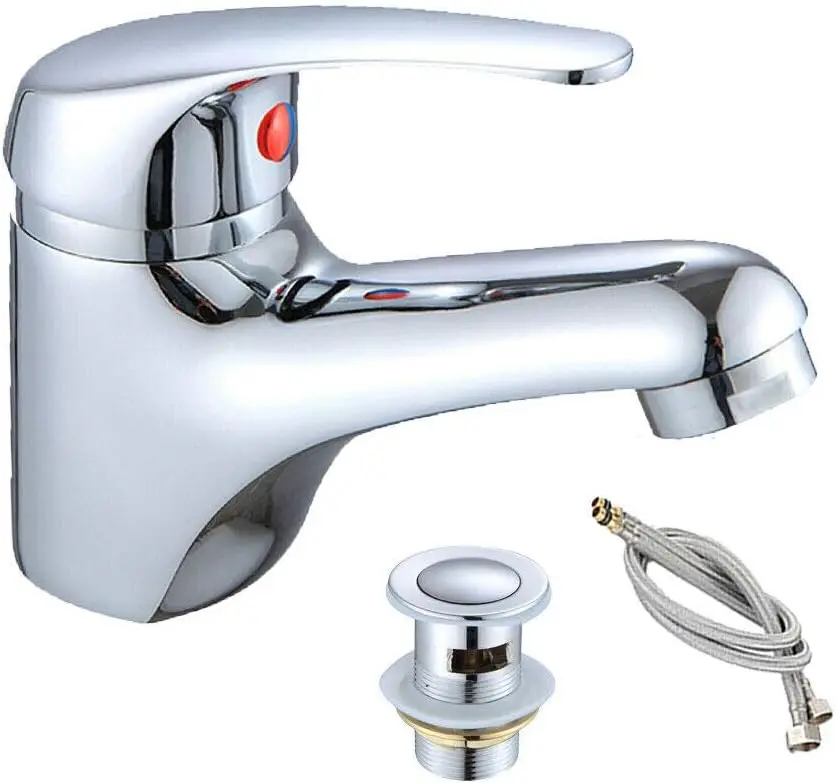 DayPlus Single Lever Basin Mixer Chrome Modern Bath Tap Monobloc Wash Basin Sink Mixer Brass with Pop Up Click Waste and 2 Hoses