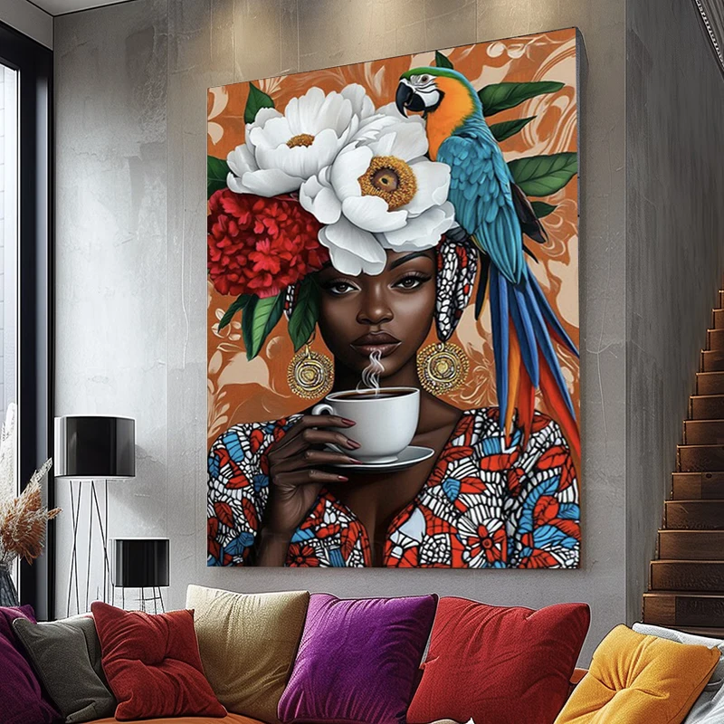 Canvas Print Woman Parrot Flower Colors Art Black, Art Wall Decor, African Portrait, Canvas Art Print Modern Wall Decor For Home