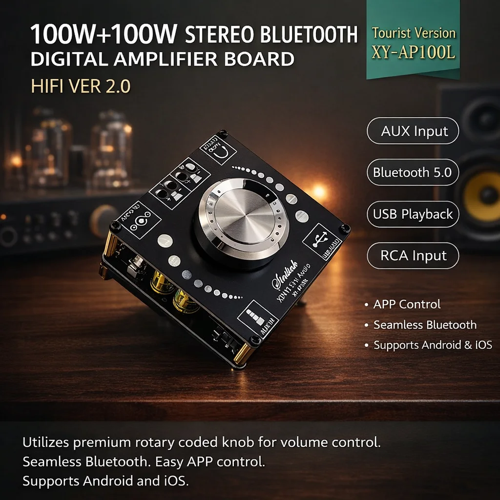 SiniAudio AP100L 100W Stereo Bluetooth Digital Power Amplifier, Dual-Channel Class-D Amp with 360° Infinite Volume Control, APP