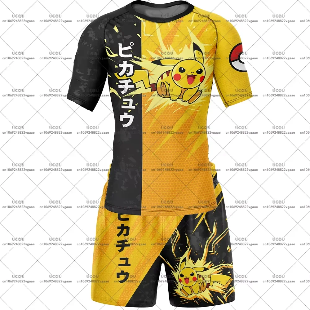 Men Kids Children Anime Casual Sportswear Tee Teenager Top Set Rashguard T Shirt Suit Pikachu Attack Pokemon Fight Shorts Gym