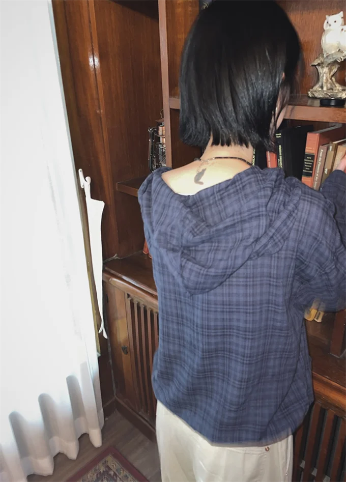 Retro SEI Vintage Plaid Thin Long Sve Hooded Casual Slimming irt Top Korean Sle Commute Stripes Women's Faion