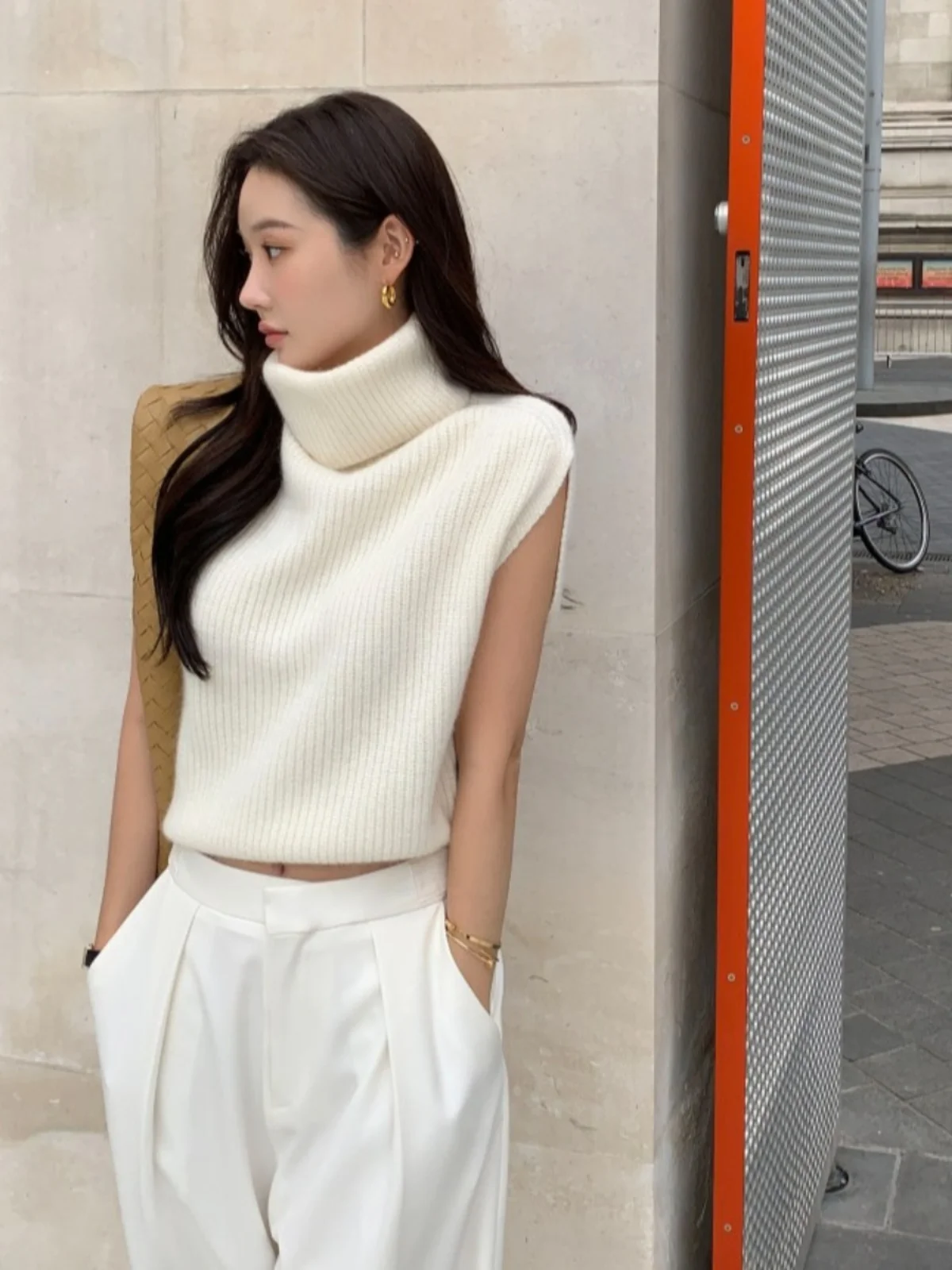Chic High-Ne Knit Vest Women's Autumn Slimming Svel Top Faionable Design Sensation Waist-Cinching Trendy Sweater