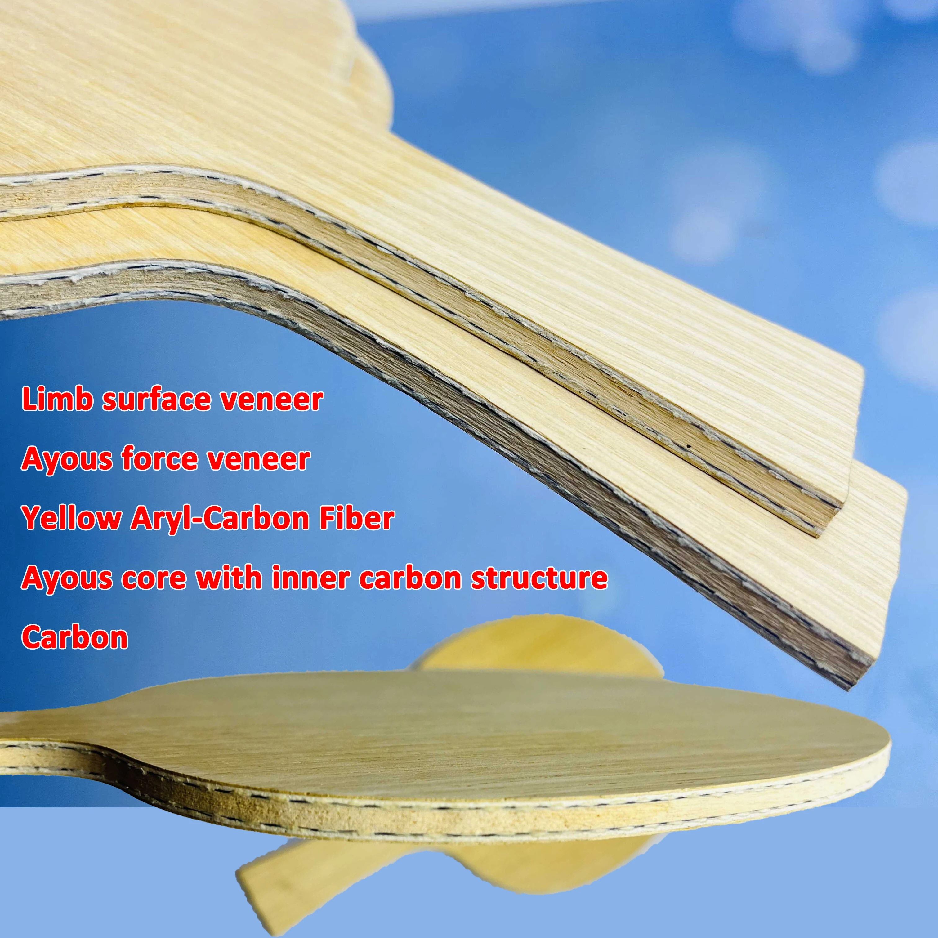 Table Tennis Blade with Limb Surface Veneer Ayous Force Veneer Yellow Aryl-Carbon Fiber Ayous Core with Inner Carbon Structure