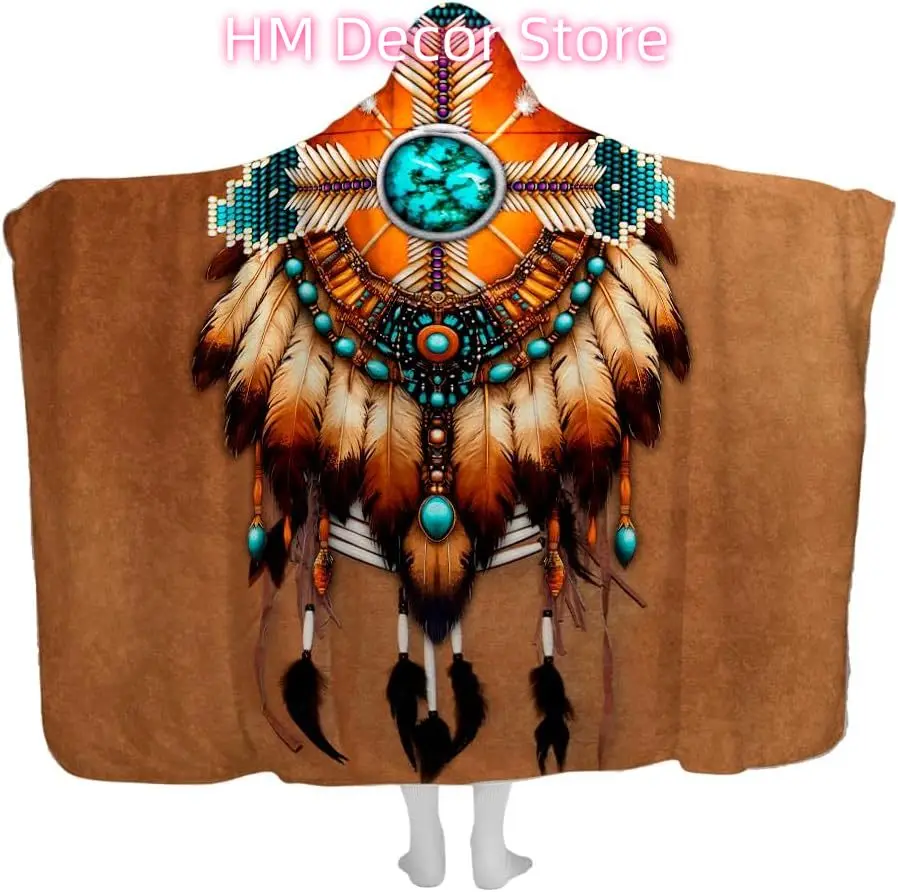 Personalized Native American Wolf Hooded Blanket, Aztec Sherpa Throw