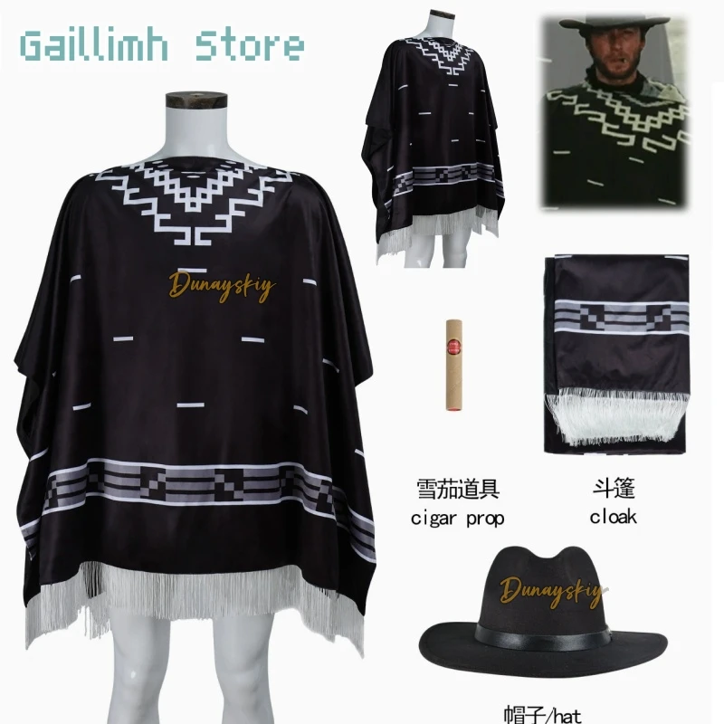 Movie Cosplay Clint Eastwood Poncho Cowboy Serape Aztec Pattern Hat Halloween Party Men Black Fringed Shawl Cape Cloak Costume
