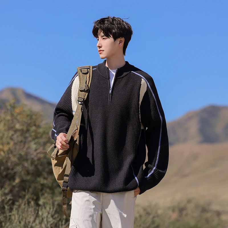 Men's Autumn and Winter Loose Comfortable Trendy Versatile Knitted Home Clothes Simple and Natural Half Zipper Pullover Sweater