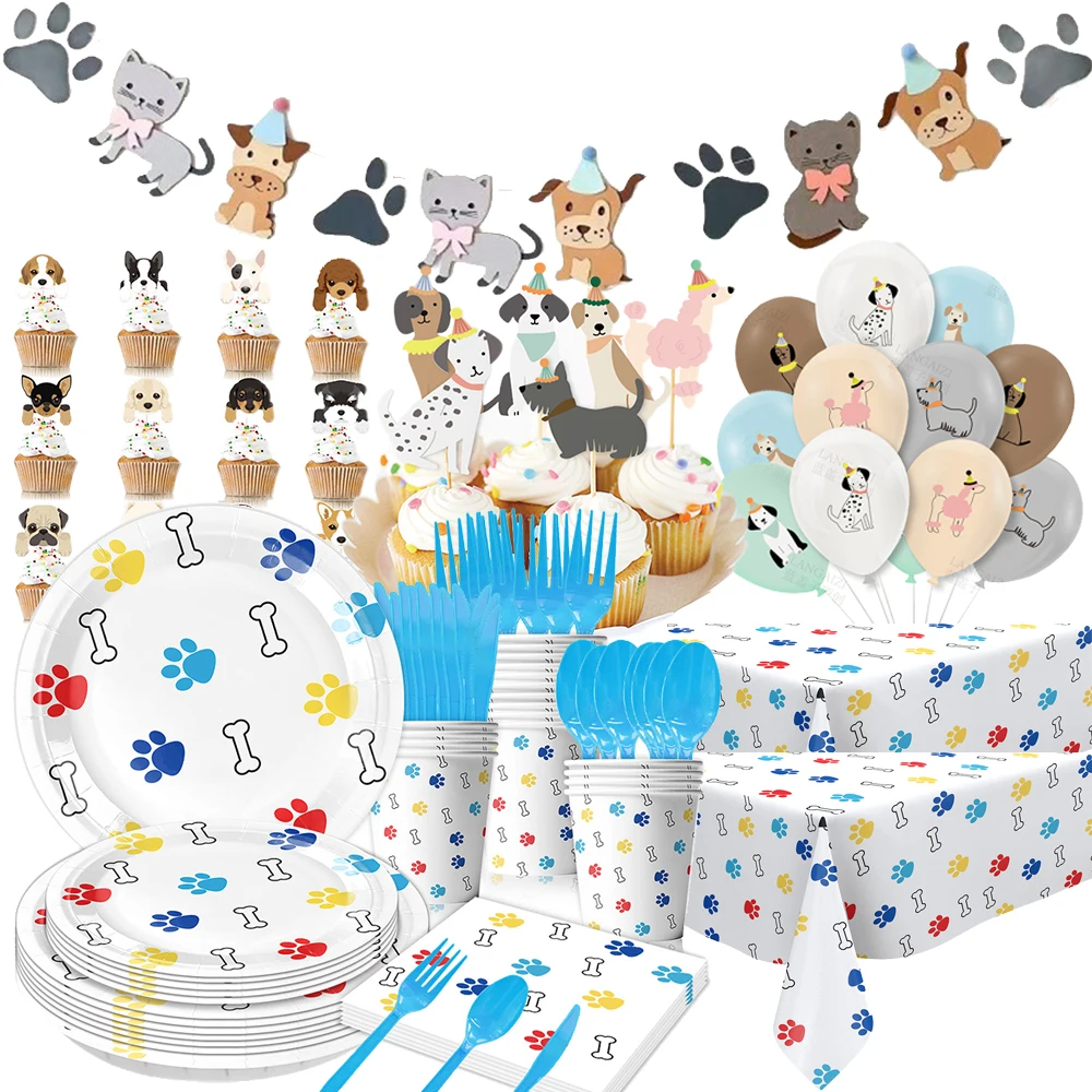 Dog Theme Party Colorful Pet Dog Paw Disposable Tableware Plates Napkins Cups Digital Balloons Dog Birthday Party Decor Supplies
