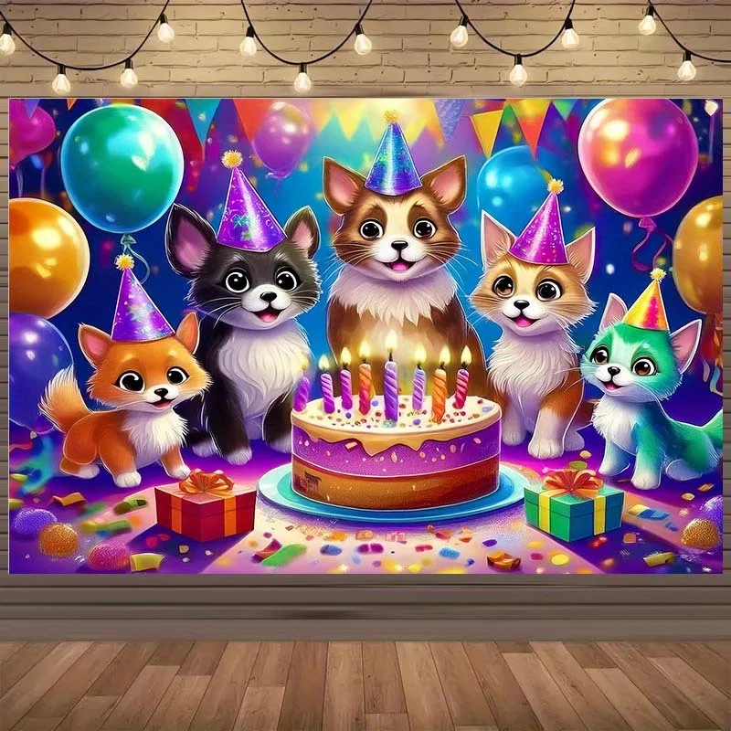 1pc 2D Birthday Party Theme Background Cloth with Cute Dogs, Colorful Balloons, Gifts, And a Celebration Cake -Suitable for