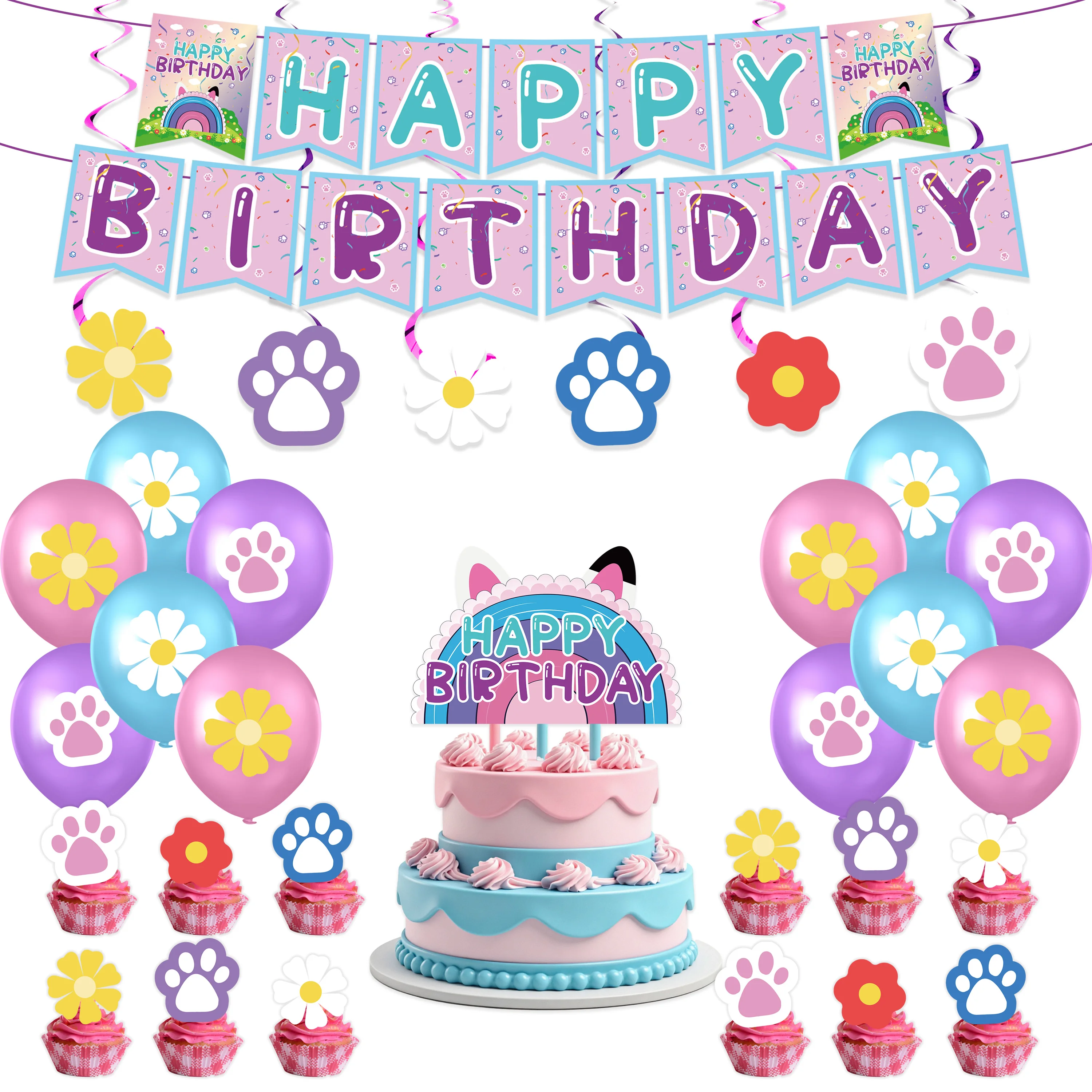 Cat Ear Rainbow Girl Theme Party Birthday Decor Dog claw Party Disposable Banner Spiral Balloon Cake Topper Set Supplies