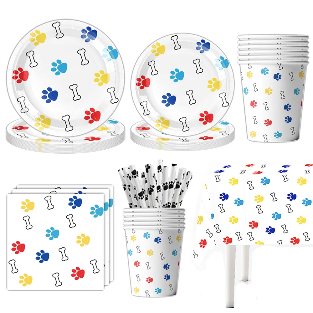Colorful Dog Paw Disposable Tableware Paper Plates Napkins Cups Straws and Number Balloon Pet Puppy Kids Birthday Party Supplies