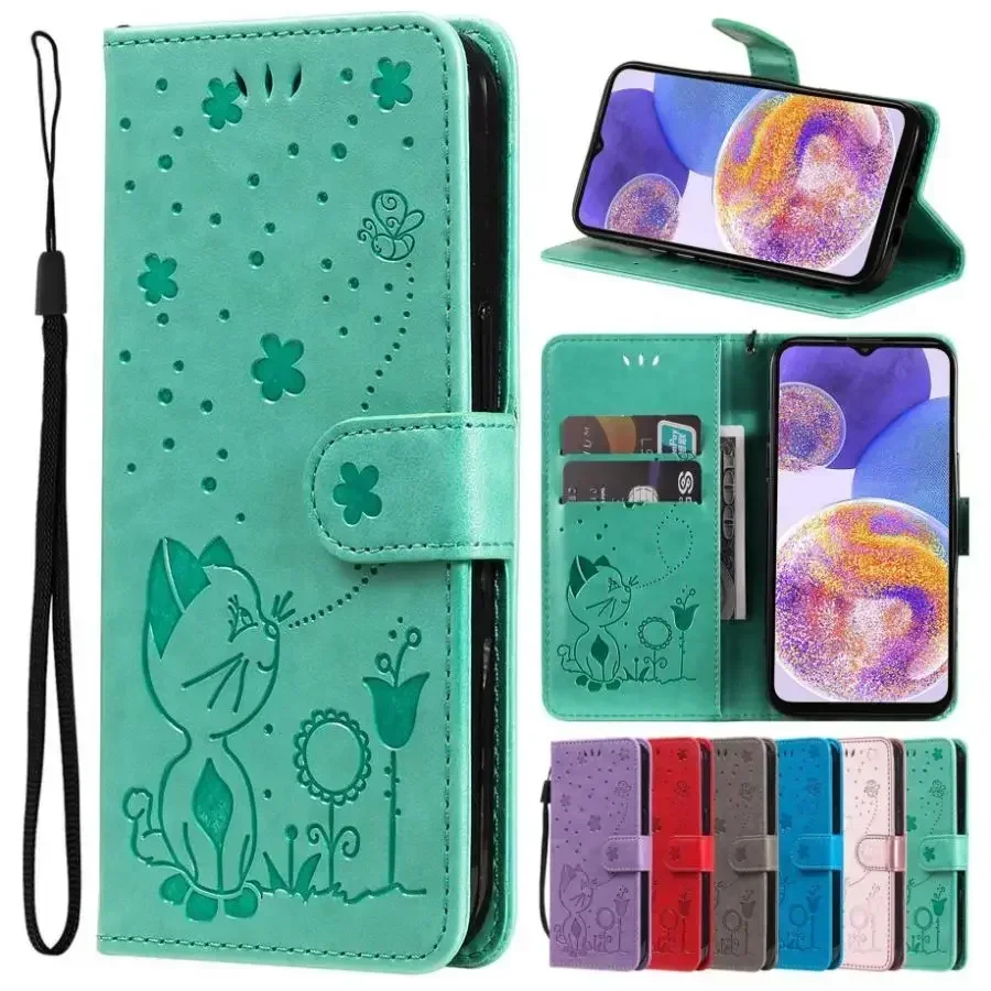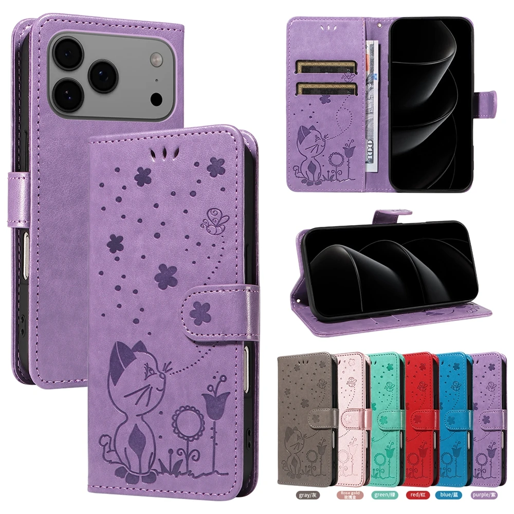 Lovely Cat Bee Leather Wallet Flip Case for iPhone 17 16e 11 12 13 Mini 14 15 8 7 6 Plus 16 Pro XS XR Max SE Phone Book Cover