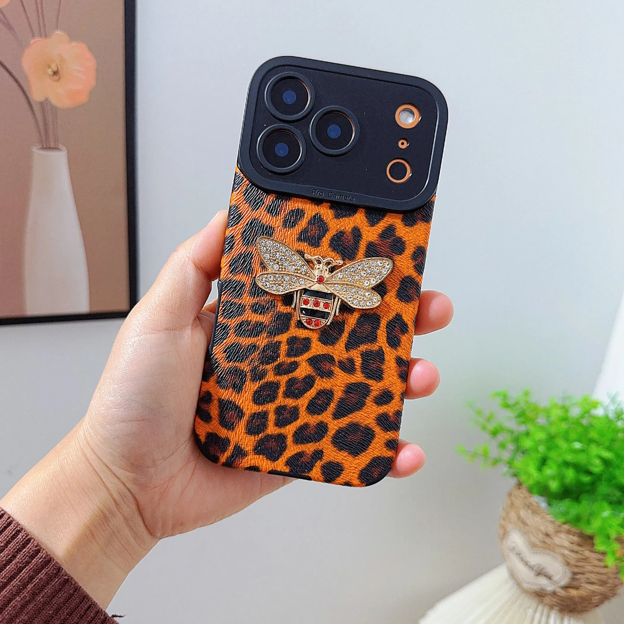 Luxury 3D bee leopard print PU leather Case for iPhone 17 16 15 Phone Cover 17 16 15 14 13 12 Pro MAX soft Shockproof Back Funda