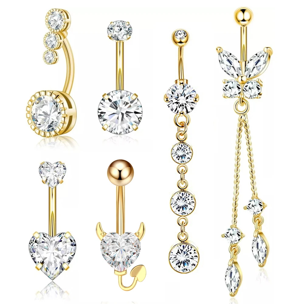6pcs/lot Gold Color Butterfly Heart Crystal CZs Belly Button Ring Sets 14G Stainless Steel Curved Navel Piercing Belly Rings