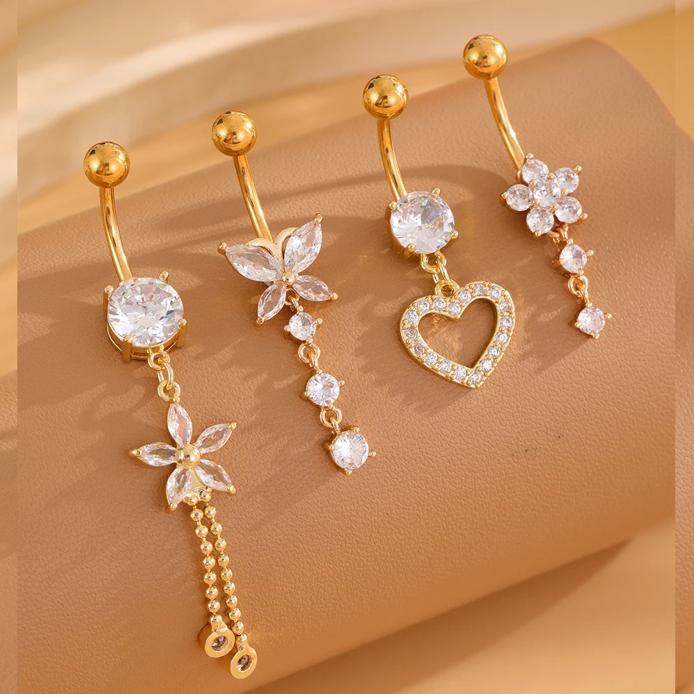 1PC Gold Color Series Belly Button Rings Wind Chime Dangled Flower Heart Belly Ring Stainless Steel CZs Navel Piercing Jewelry