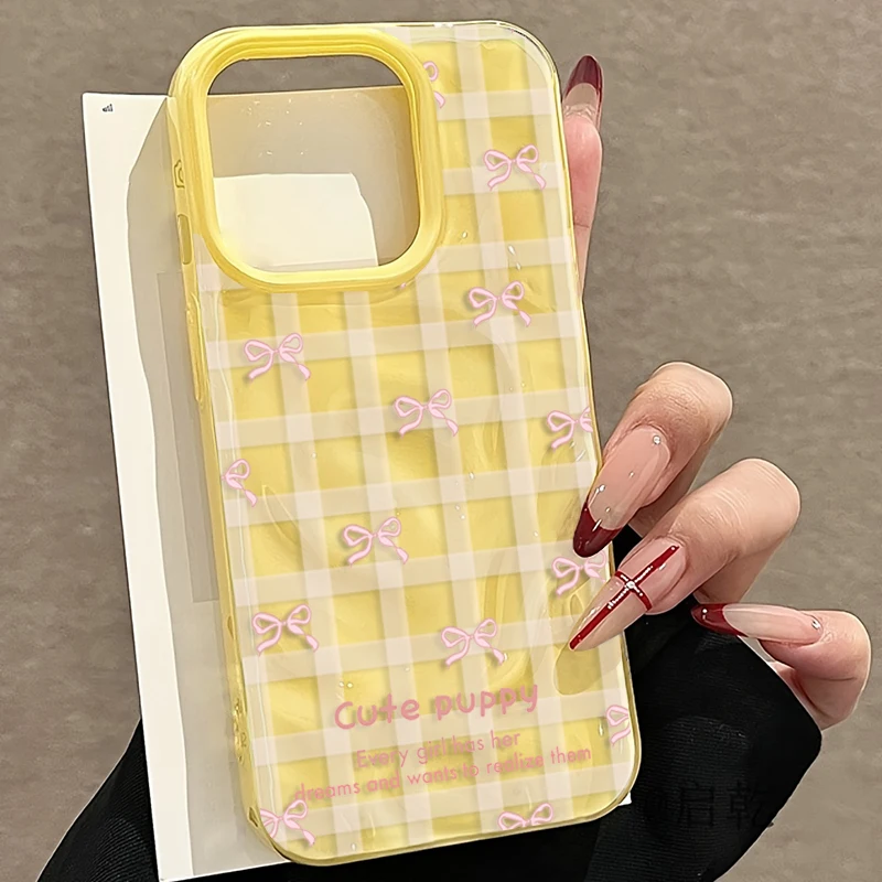Cute Pink Bow Grid Phone Case for iPhone 11 12 13 14 15 16 Plus 17 Pro Max Air Blue White TPU Shockproof Soft Protective Cover