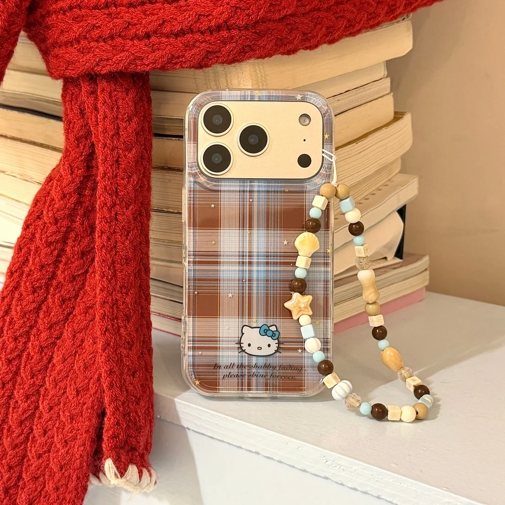 Retro Brown Blue Grid Pattern Glitter Case For iPhone 17 Pro Max 15 16 14 Pro Max Translucent Sequin Star Cover With Chain