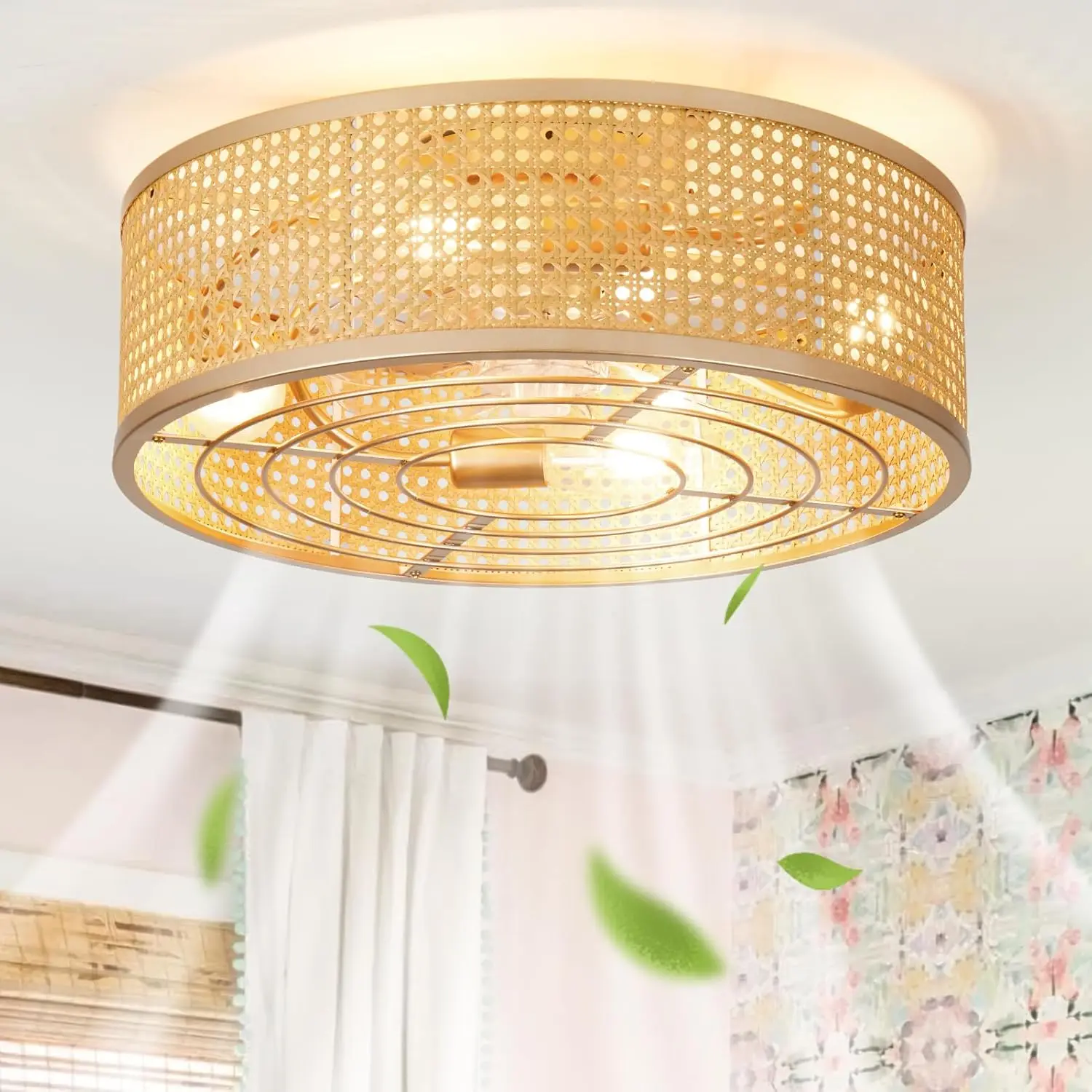 Rattan Boho Ceiling Fan with Light Flush Mount Gold Caged Ceiling Fans with Light and Remote Control for Bedroom Kitchen Living