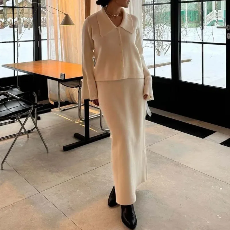 Fashion Button Hight Waist Long Skirt Suit Casual Long Sleeve Women's Knit Set Elegant Lapel Long Sleeve Cardigan Sweater Outfit
