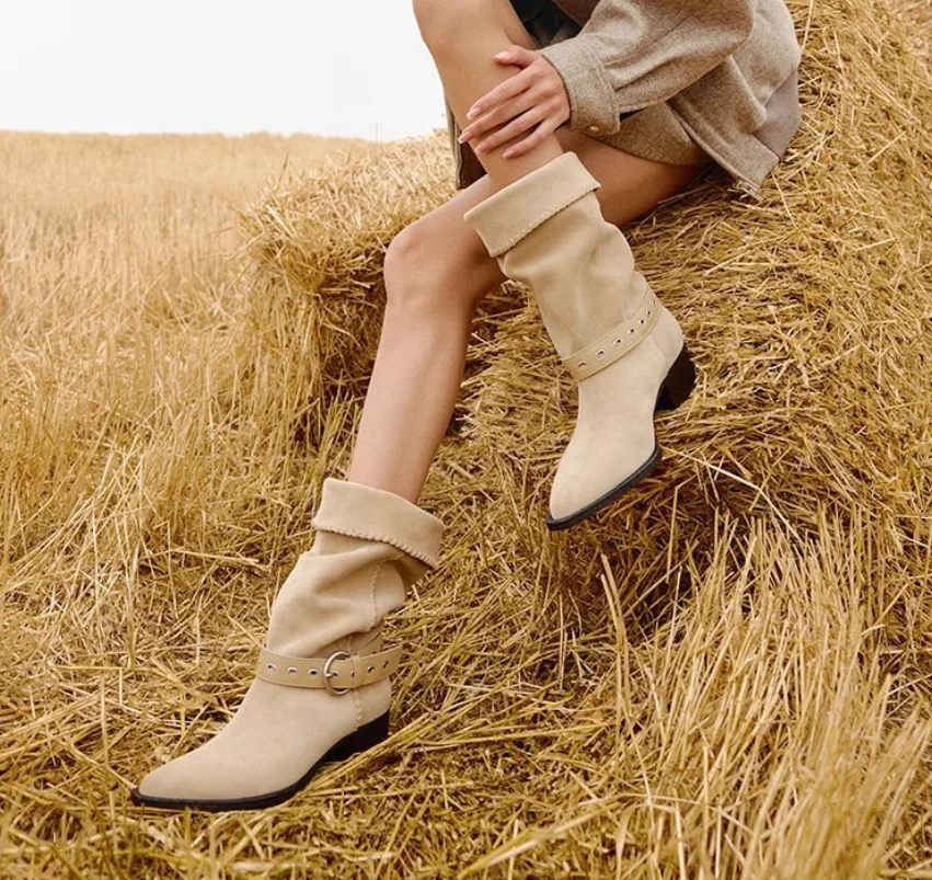2026 Spring Women Slouchy Ethnic Boho Boots Rome Gladiator Faux Suede Bohemia Mid-calf Boots Block Low Heel Shoes Western Bootie