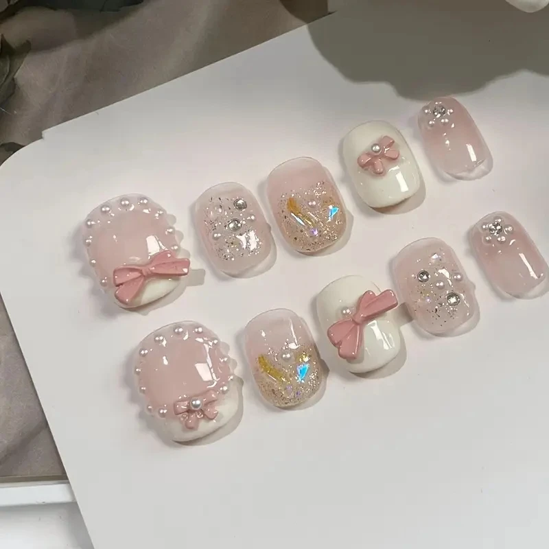 10pcs high-end Light luxury short cute bow handmade fake nails, Cute style girl nail decoration patch