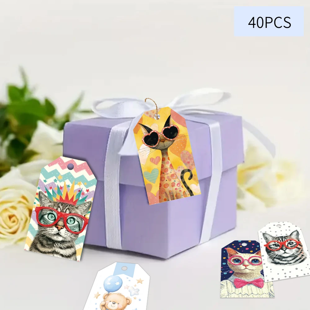 40pcs Colorful Cat Decorative Tags, Cute Aesthetic Gift Labels, Party Decoration, Handmade Packaging Accents, cards, Jute Rope