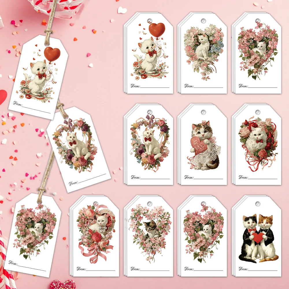 40pcs Valentine's Day Cat Love Decorative Tags, Aesthetic Gift Labels, Party Decoration,Handmade Packaging Accents,Colorful Rope