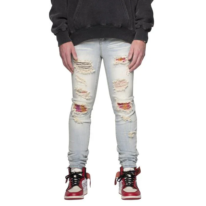 Y2K Blue Pink Bandana Patchwork Jeans Vintage Ripped Hip Hop Micro Elastic Jeans Gothic Harajuku Men Women Slim Pencil Pants