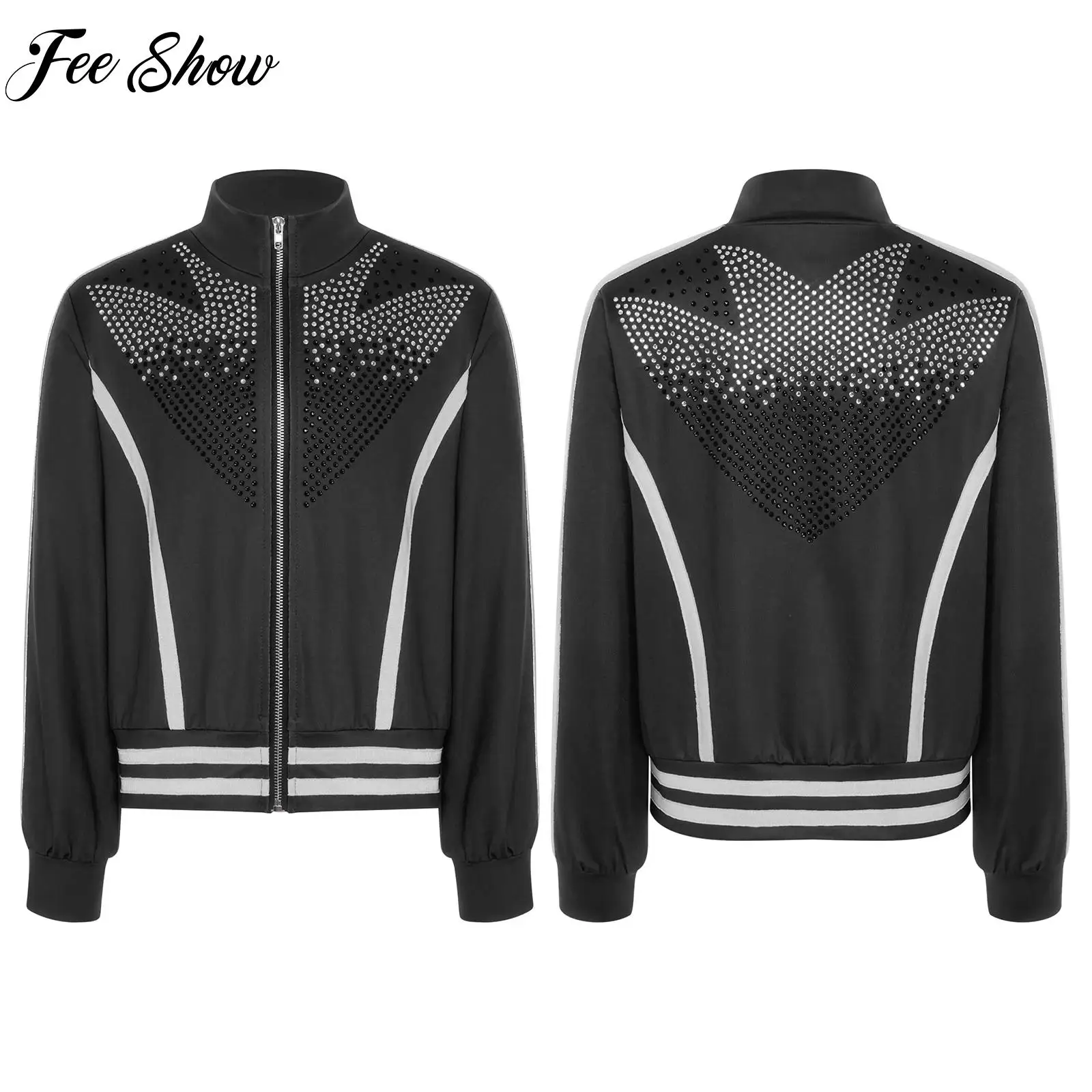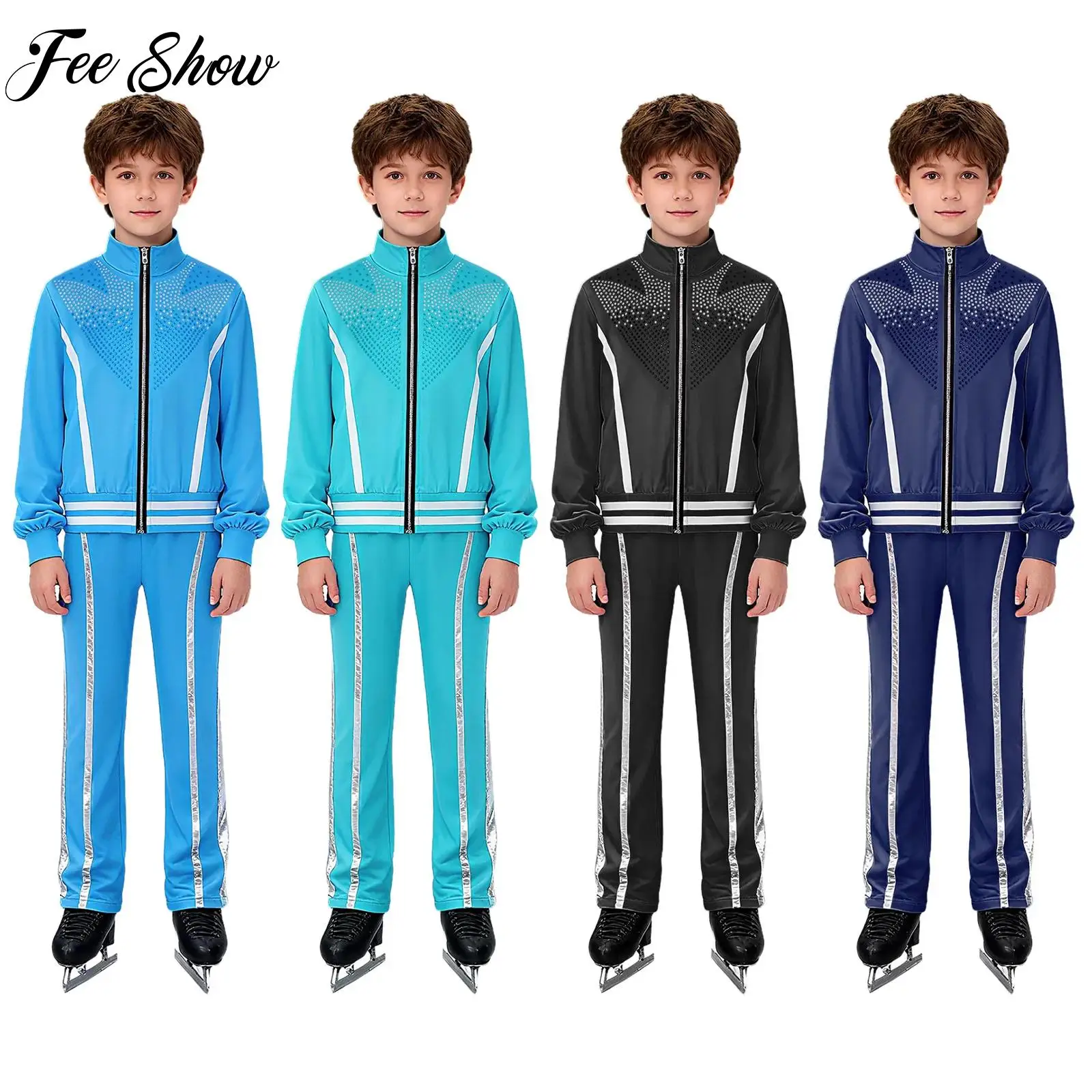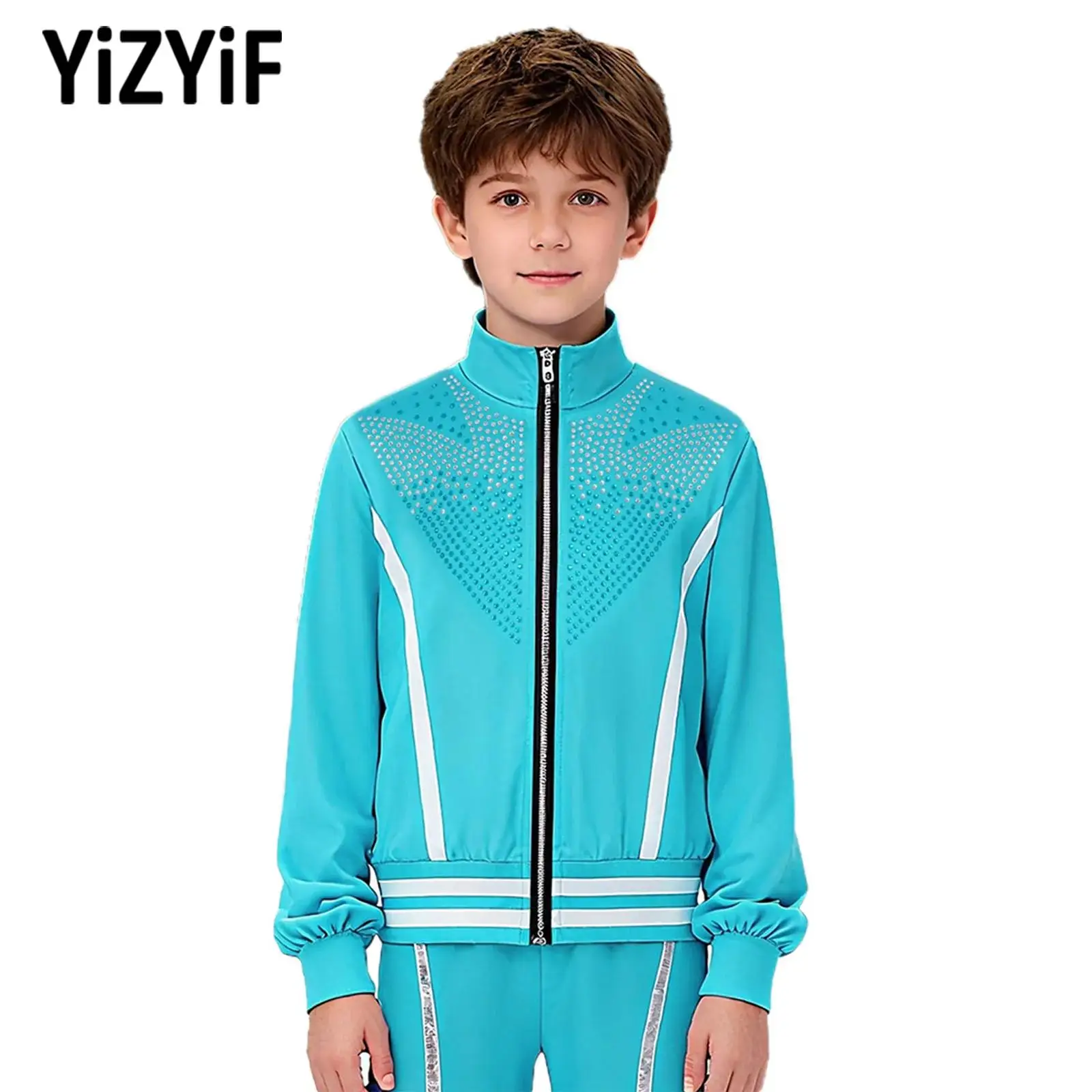 Children Boys Long Sleeve Figure Ice Skating Roller Skating Costume Shiny Rhinestones Zipper Jacket Top for Practice Performance