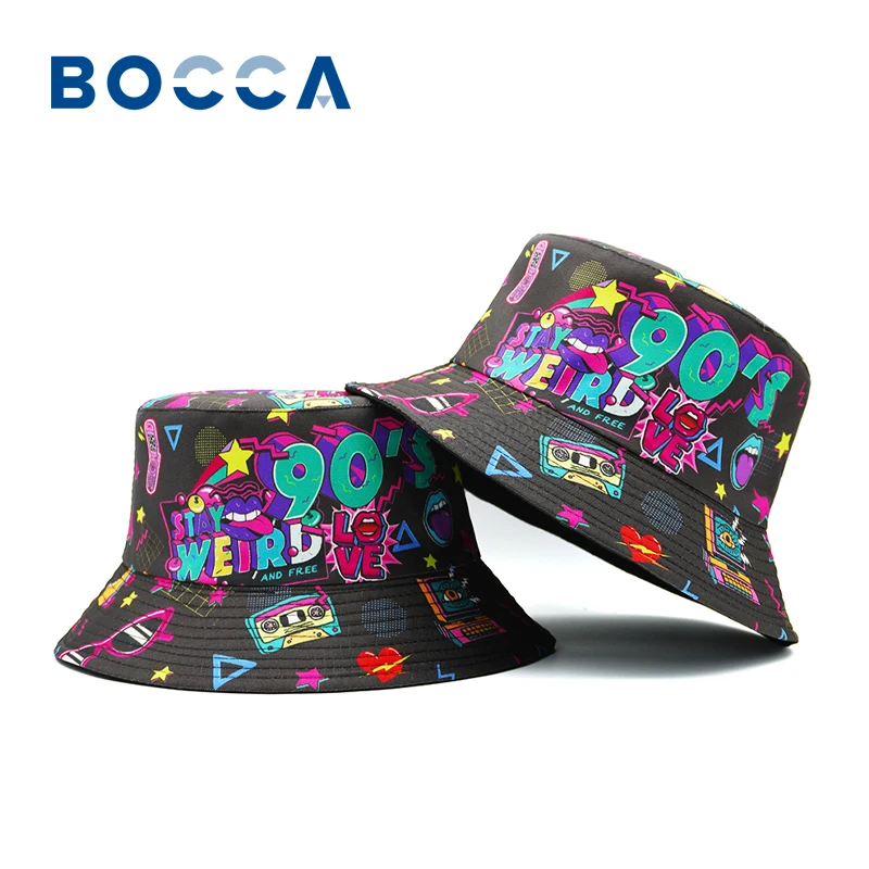 Bocca 90s Disco Bucket Hat Vintage Style Fisherman Hats Cartoon Printing Panama Cap Double Sides Location Design Cap Sun Outdoor