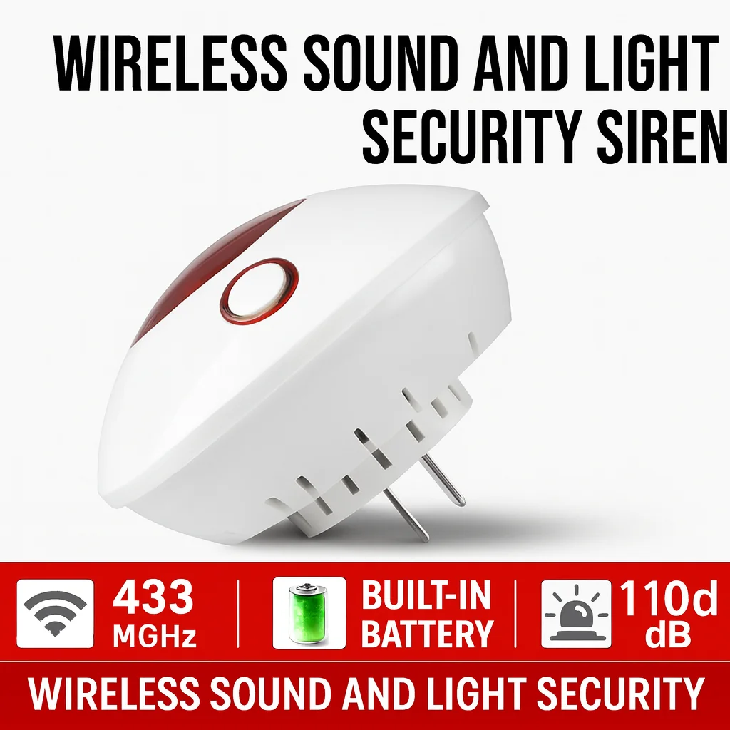 433MHz Wireless Siren Strobe Alarm | 110dB Sound & Flash | Plug-in AC Outlet | Built-in Battery Backup | EU/US Plug