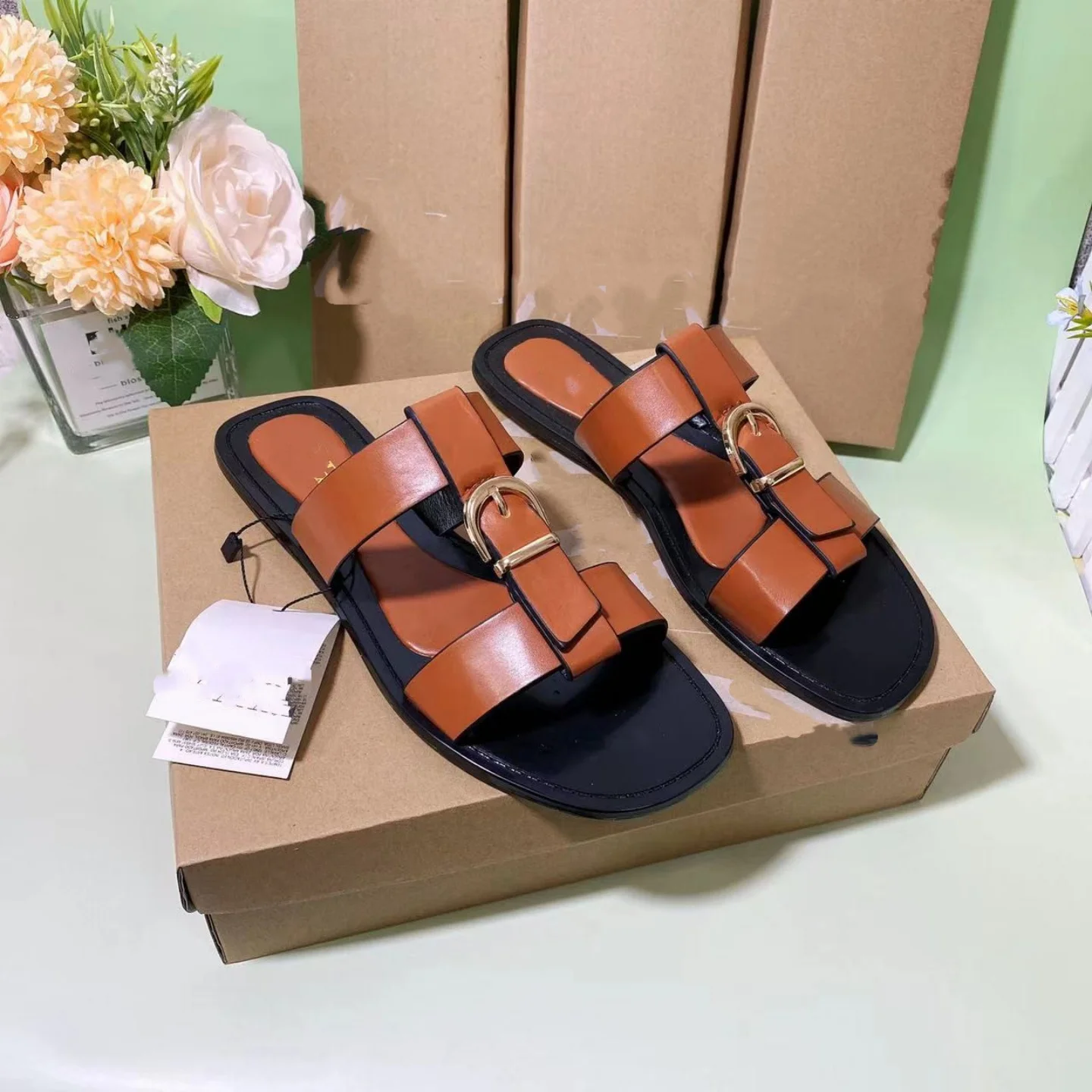 Spring Summer New Women's Flat Sandals Metal Bule Slip-On Casual Slippers round Toe Simple Design Rubber Sole Comfortable S...