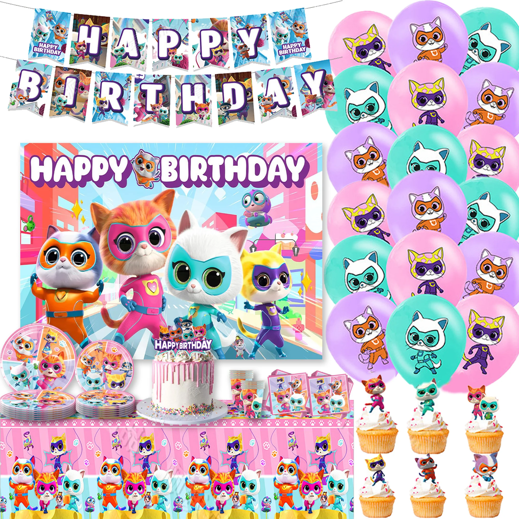 Cute Super kitties series Birthday Party dinnerware Disposable Banner Cake Topper Hanging Flag kitties Balloons Cake Decoration