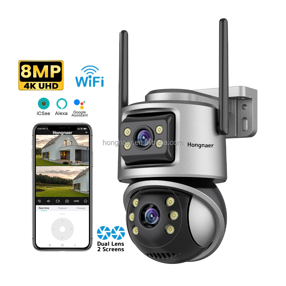 Hongnaer Smart Outdoor Wireless PTZ Surveillance IP Camera Dual Lens ICSee 8MP 4K Video WiFi CCTV Network Home Security Camera
