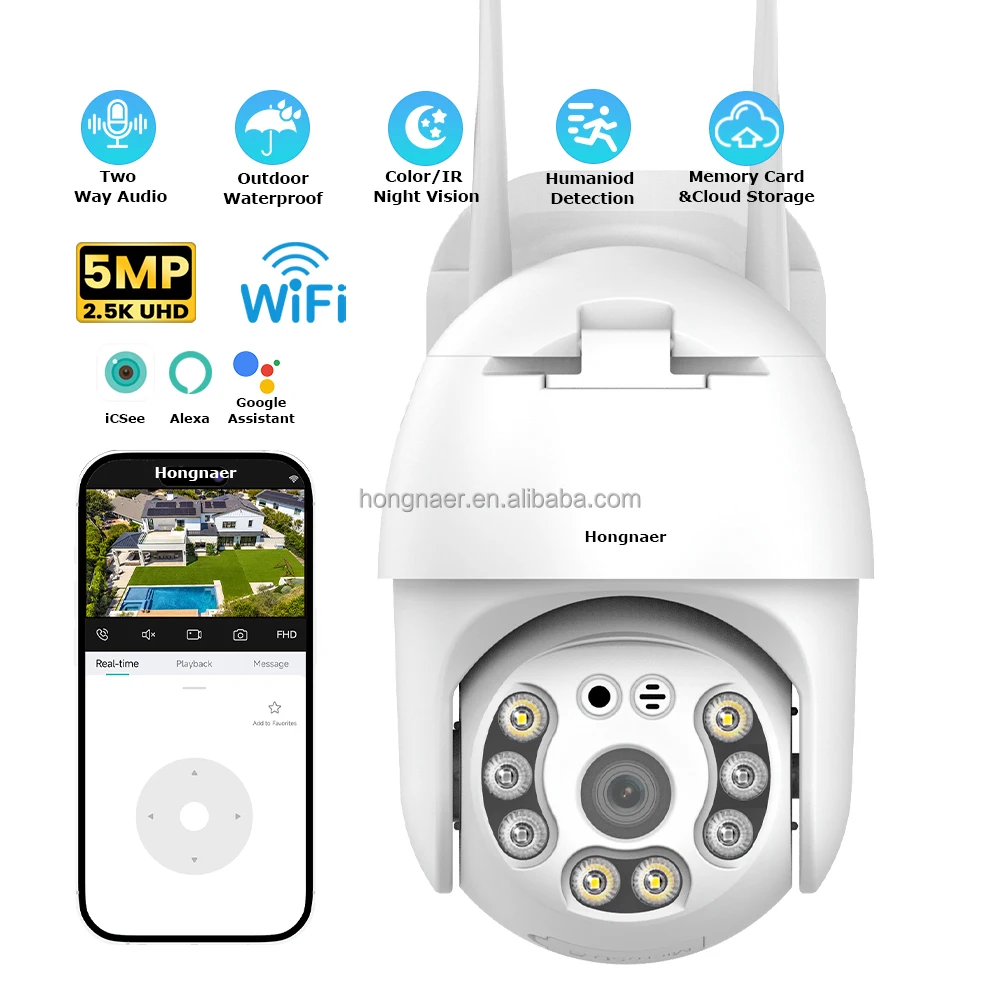 Hongnaer 5MP HD Night Vision Smart Video Outdoor PTZ IP Surveil Camera ICSee 360 Wireless WiFi CCTV Home Security Camera