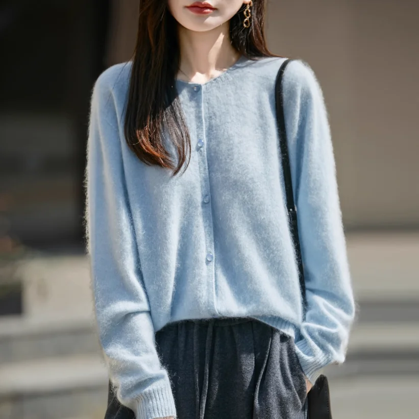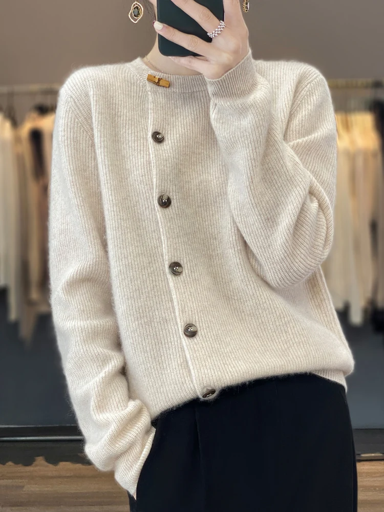 Autumn and winter new cashmere sweater women round neck thick plus size sweater cardigan Horn button loose sweater