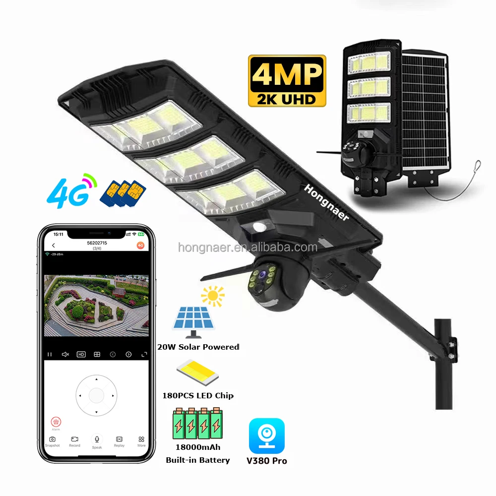 Hongnaer 4MP 4G LTE Wireless Solar Power Surveil Security PTZ Camera V380 Pro Outdoor 4G Sim Card CCTV Solar Street Light Camera