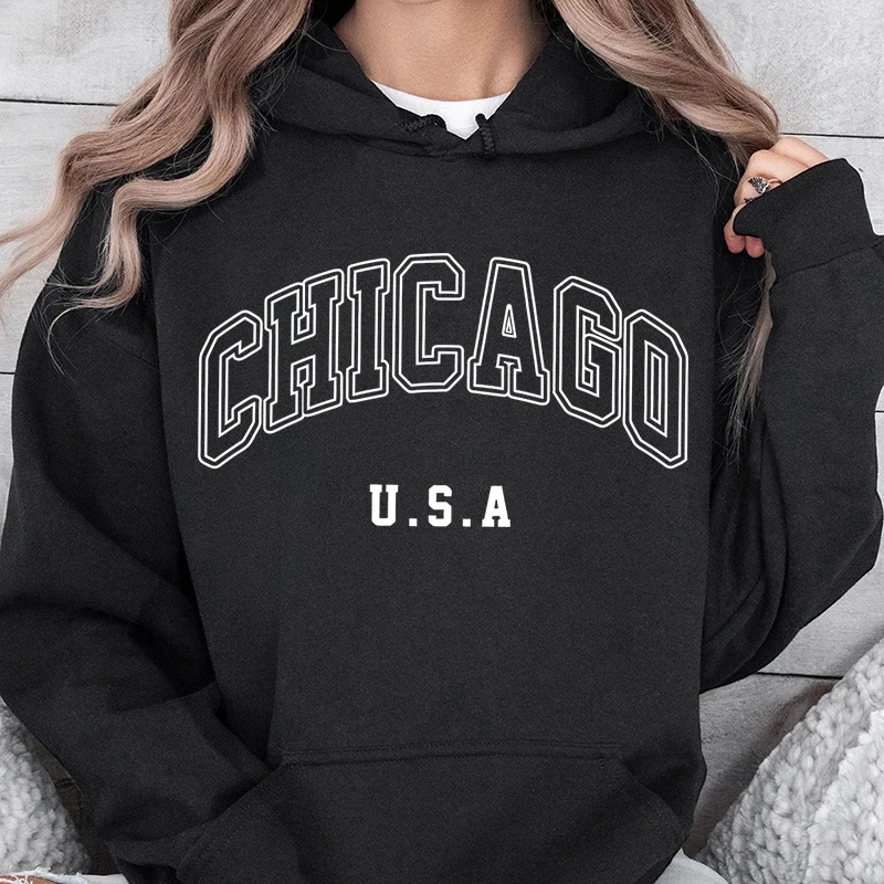 Casual Woman Hoodie Chicago Usa City Letter Graphic Printing Pullover Fleece Comfortable Pocket Sweatshirt Autumn Streetwear