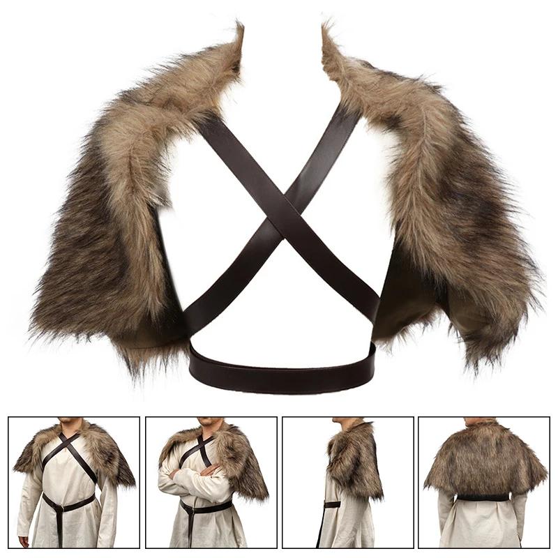 Viking Cloak Faux Fur Collar Cape Medieval Winter Clothing King Warrior Shawl with Chest Strap Cloak Halloween Cosplay Costume