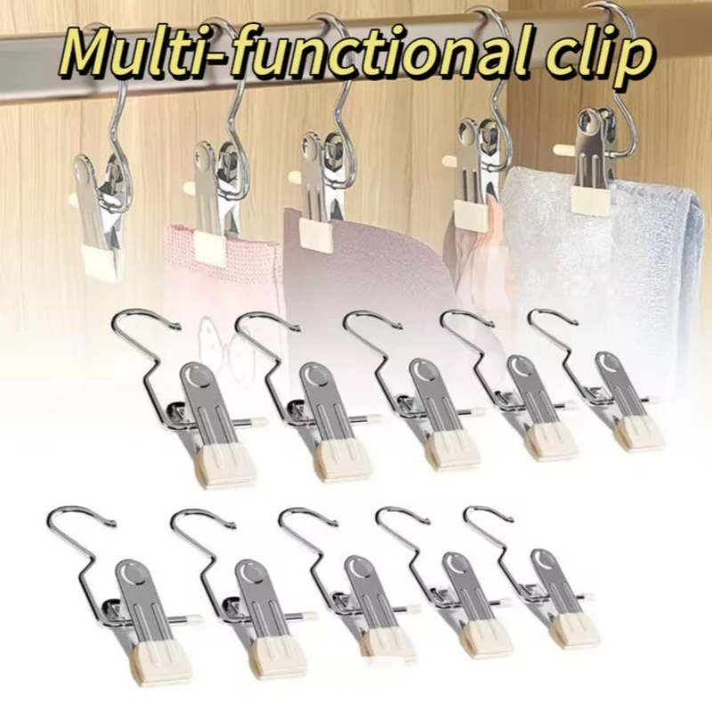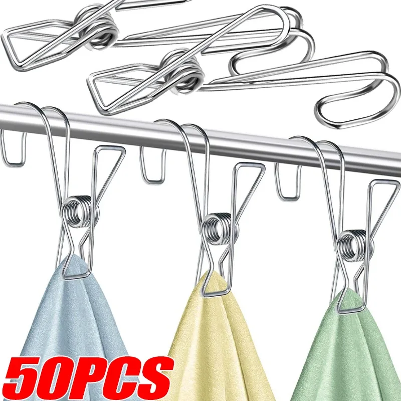 50/10PCS Multi-Purpose Stainless Steel Clothespins with Hooks Metal Spring Clips Hanging Towel Clips for Kitchens Bathroom