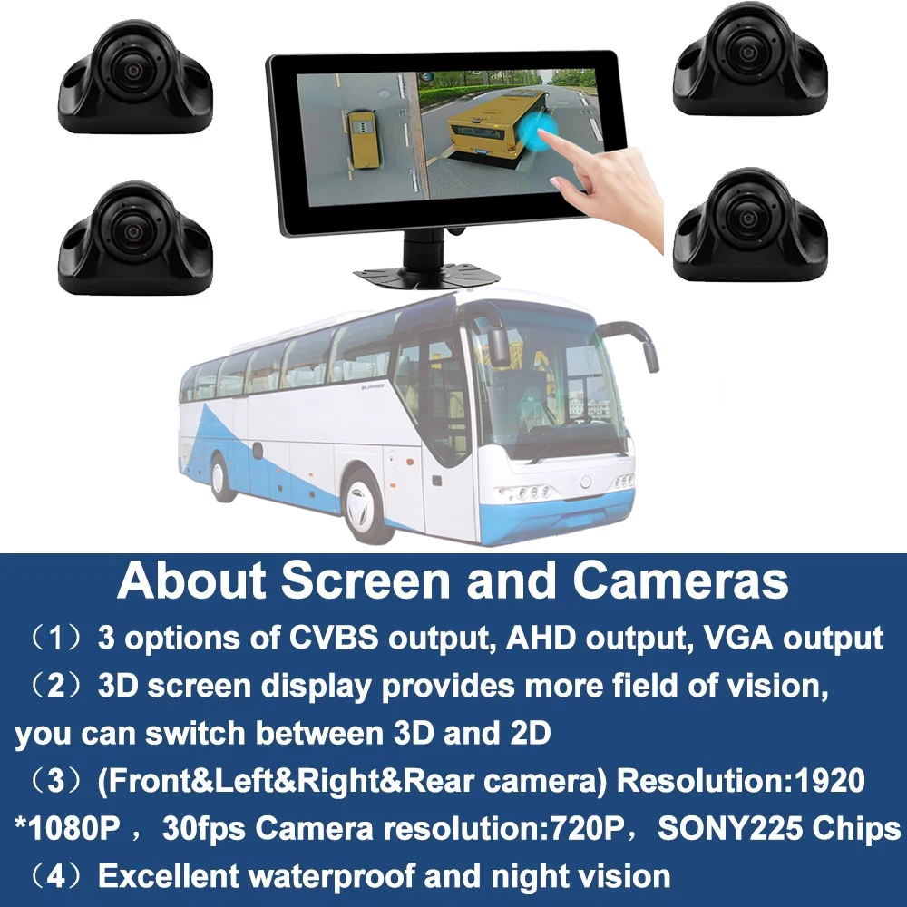 For Bus Truck RV Motorhome 360° Panorama Bird's Eye View Camera Car System 3D 1080P Recorder With 10.25" Touch Screen