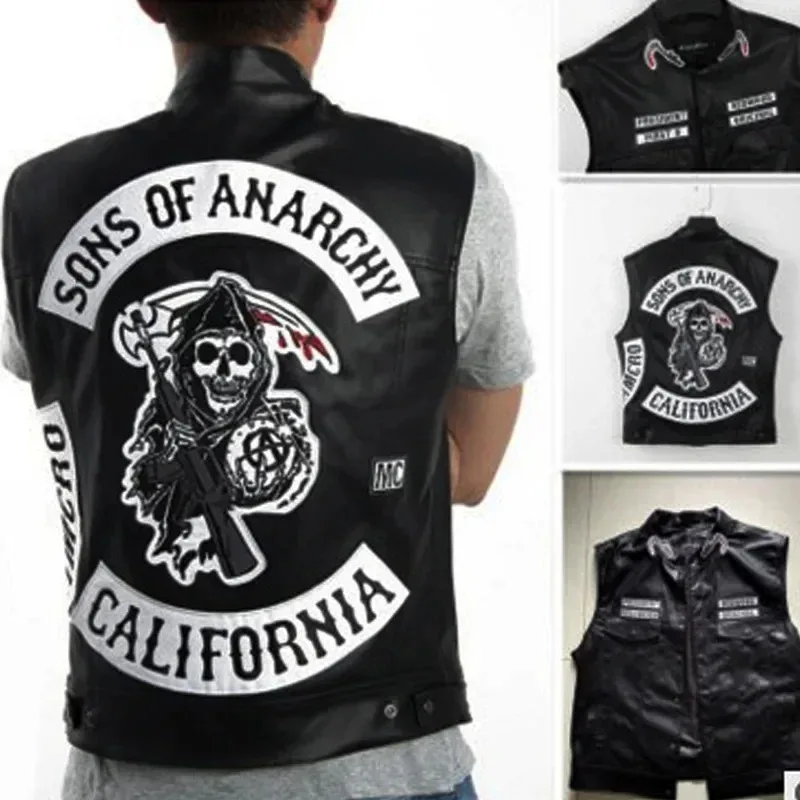 New 2026 Leather Men Motorcycle Cosplay Costume Sleeveless Jacket Sons Of Anarchy Embroidery Rock Punk PU Vest V Neck Cosziy
