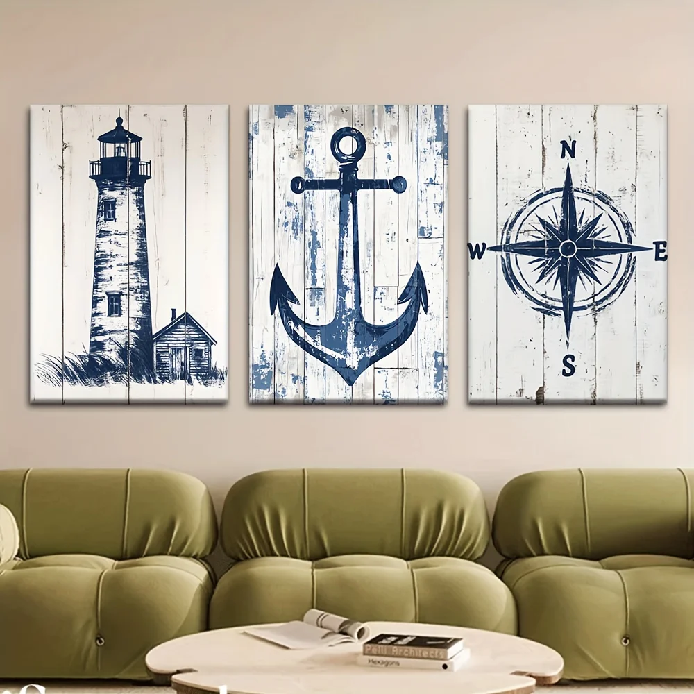 Set of 3 Nautical Lighthouse Anchor Compass Wall Art Posters And Prints, Vintage Nautical Art Canvas Paintings, Living Room Home