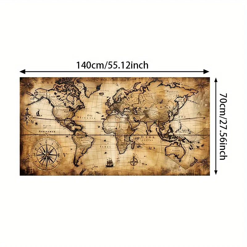 [2D Flat] 1pc Vintage World Map Canvas Art - Frameless, Earth-Toned with Compass and Nautical Elements, 70.0x140.0cm, Modern