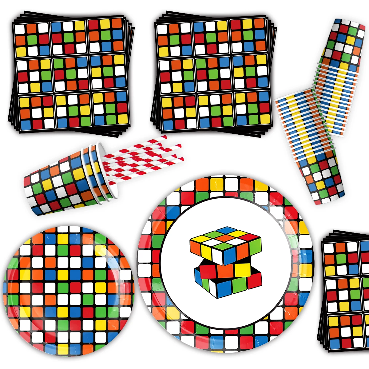 Rubik's cube Theme Birthday Party Decoration Boys Girls Tableware Supplies Tablecloth Balloon Cake Topper Straw
