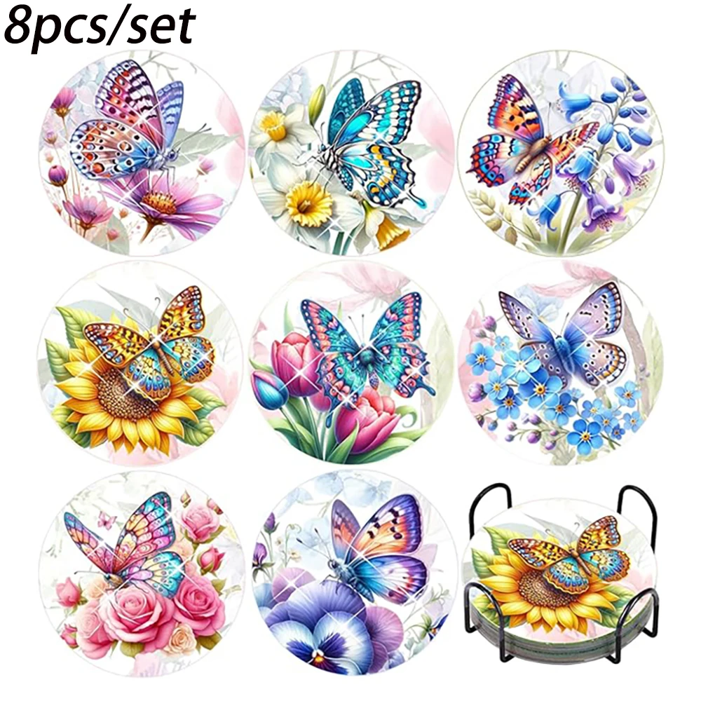 8 pieces of diamond art painting coasters with brackets, DIY colorful butterfly diamond art coasters, suitable for both adults a